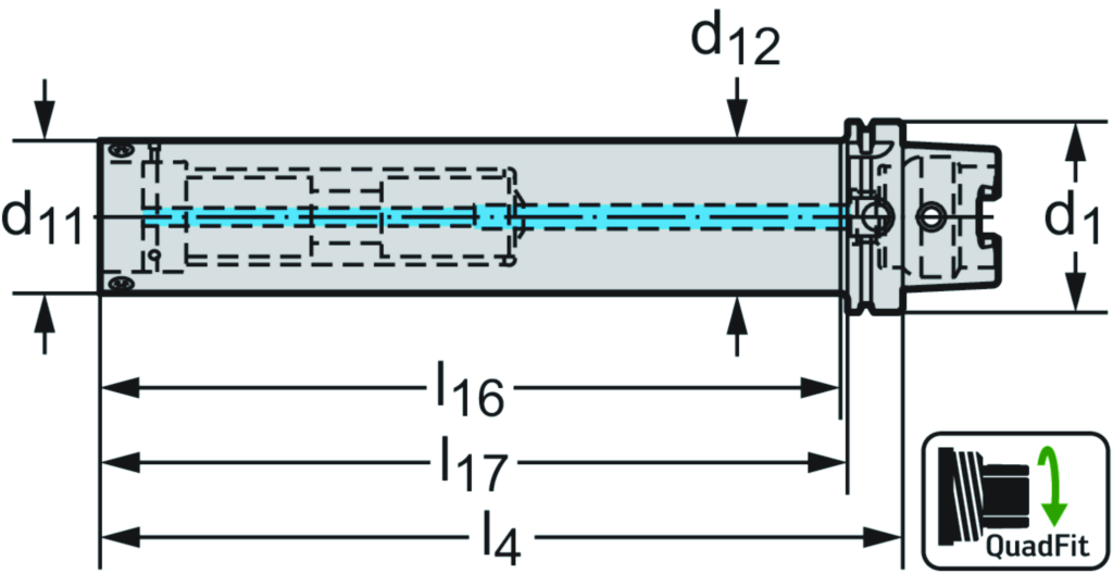 HSK-T Aufnahme – schwingungsgedämpft A3001-HSK-T • metrisch • Für A2201 Zwischenadapter mit QuadFit Schnittstelle • Mit voreingestellter Schwingungsdämpfung • d1=100 • d11=QL80