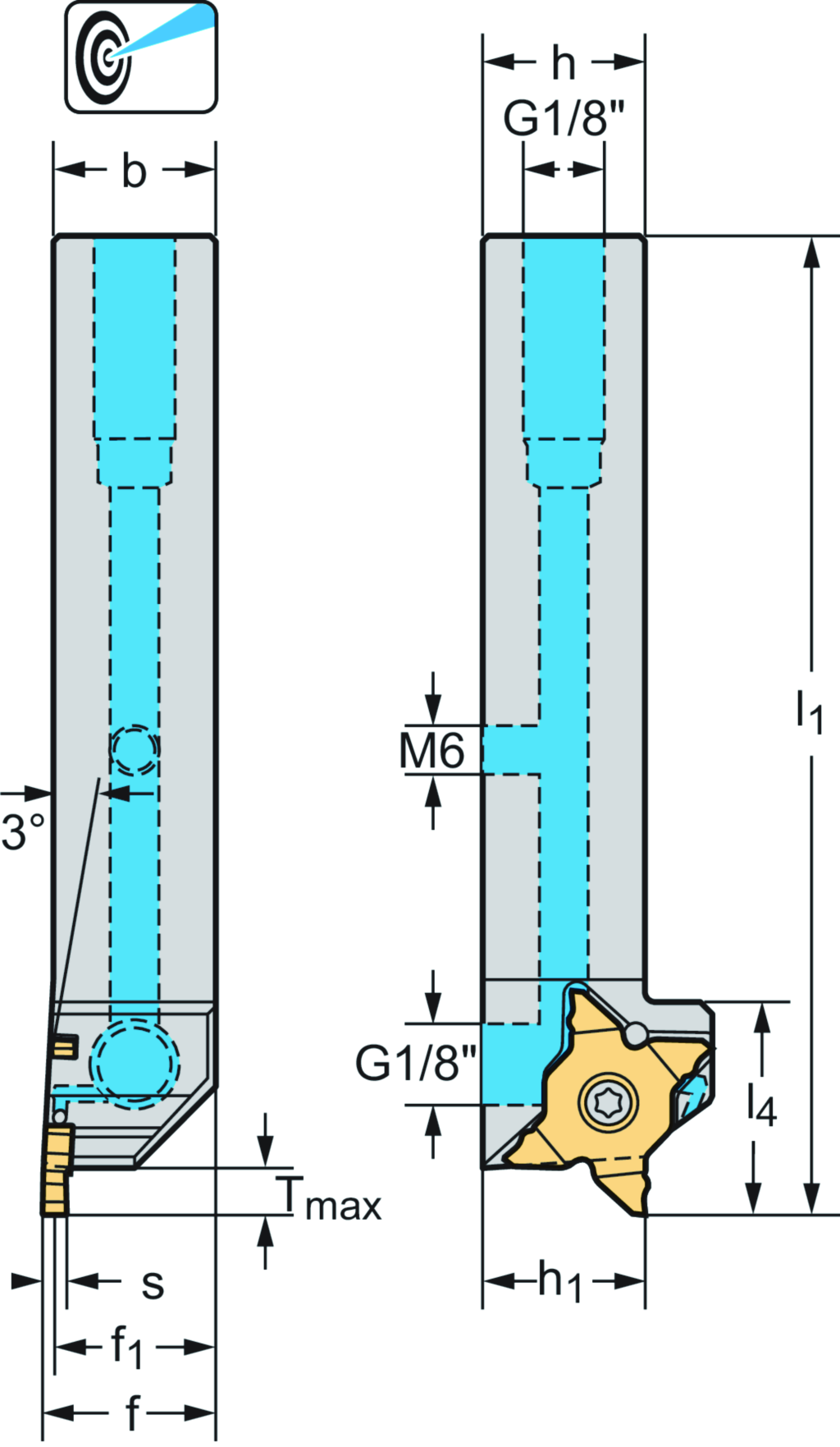 Schaftwerkzeug 3° – Radialstechen G3051...-P • Ein- und Abstechen an hohen Schultern • Präzisionskühlung • metrisch • Vierkantschaft • links • MX22 • s=1mm • Tmax=6mm