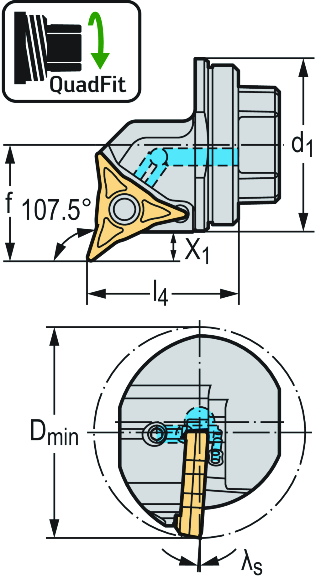 Wechselkopf – Kopierdrehsystem W1211-Q... • Walter Turn • metrisch • QuadFit • rechts • Platte mit speziellem Profil • WL .. 2504 .. • Präzisionskühlung